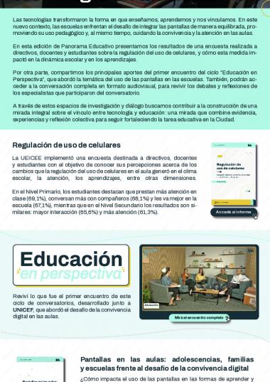 En esta edición de Panorama Educativo presentamos los resultados de una encuesta realizada a directivos, docentes y estudiantes sobre la regulación del uso de celulares, y cómo esta medida impactó en la dinámica escolar y en los aprendizajes. Por otra parte, compartimos los principales aportes del primer encuentro del ciclo “Educación en Perspectiva”, que abordó la temática del uso de las pantallas en las escuelas. También, podrán acceder a la conversación completa en formato audiovisual, para revivir los debates y reflexiones de los especialistas que participaron del conversatorio.